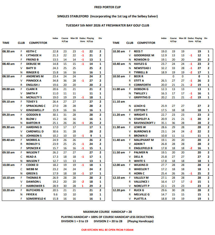 | Tue 5th May | F'water | Porter Cup & 1st Leg Selby Salver |